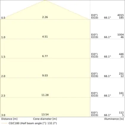 Der Abstrahlwinkel bezeichnet den Winkel, in dem das Licht aus der Lichtquelle ausgestrahlt wird. Er wird in Grad (D) angegeben. Je geringer die Gradzahl des Abstrahlwinkels ist, desto kleiner ist auch der Durchmesser des Lichtkegels, den die Lichtquelle produziert. Beispiel: Wird eine Lampe mit einem Abstrahlwinkel von 60 Grad an der Decke (2,5 m Höhe) angebracht, erzeugt sie einen Lichtkegel von 2,9 Metern Durchmesser. Hat die Lampe hingegen einen Abstrahlwinkel von 120 Grad, beträgt der Lichtkegel 8,7 Meter im Durchmesser. |