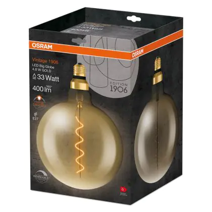 Die Osram Vintage 1906 LED E27 Globe Filament Gold 200mm 4.8W 400lm - 822 Extra Warm White | Dimmable ist eine effiziente E27 LED-Lampe mit Retrodesign und der perfekte Ersatz für Ihre konventionellen 33W Lampen mit E27. Zudem strahlt sie Licht in der Farbtemperatur 2200K - Extra Warmweiß aus und punktet durch eine lange Lebensdauer.