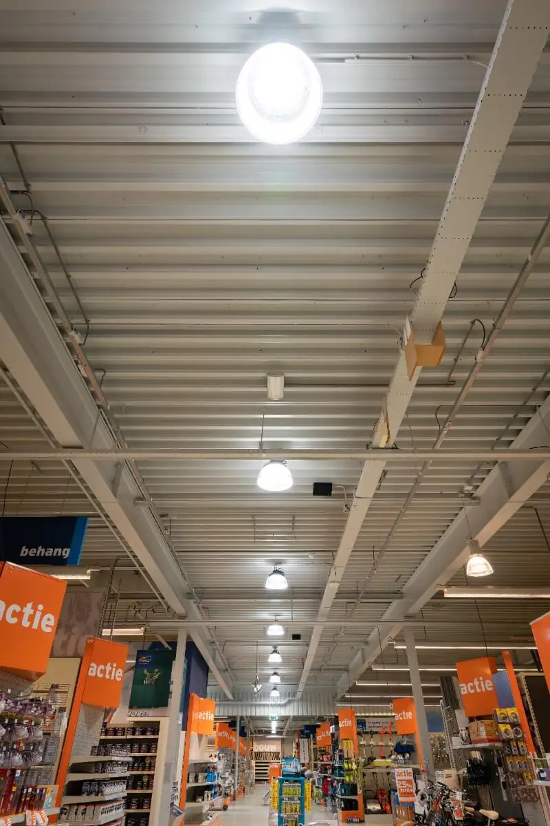 Zunächst haben wir Leuchten von Noxion installiert, die zusammen eine gut beleuchtete und komfortable Einkaufsumgebung schaffen. Es ist wichtig, dass der Laden gut beleuchtet ist, denn das sichtbare Licht hat einen großen Einfluss darauf, wie wir den Baumarkt und seine Waren wahrnehmen. Tatsächlich werden wir unbewusst von gut beleuchteten Geschäften und Produkten angezogen. Darum haben wir auch LED-Highbays mit speziell ausgewählten Reflektoren installiert, die für eine gute Lichtverteilung sorgen, sodass die Produkte ideal beleuchtet sind. Gleichzeitig sind die Produkte prismatisch abgedichtet, damit die Kunden nicht von der Beleuchtung geblendet werden.